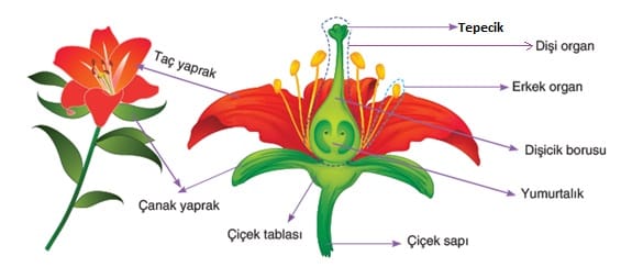 Not: Bazı çiçeklerde yalnız erkek organ veya yalnız dişi organ bulunur; ancak genellikle çoğu çiçekte hem erkek organ hem de dişi organ birlikte bulunurlar.